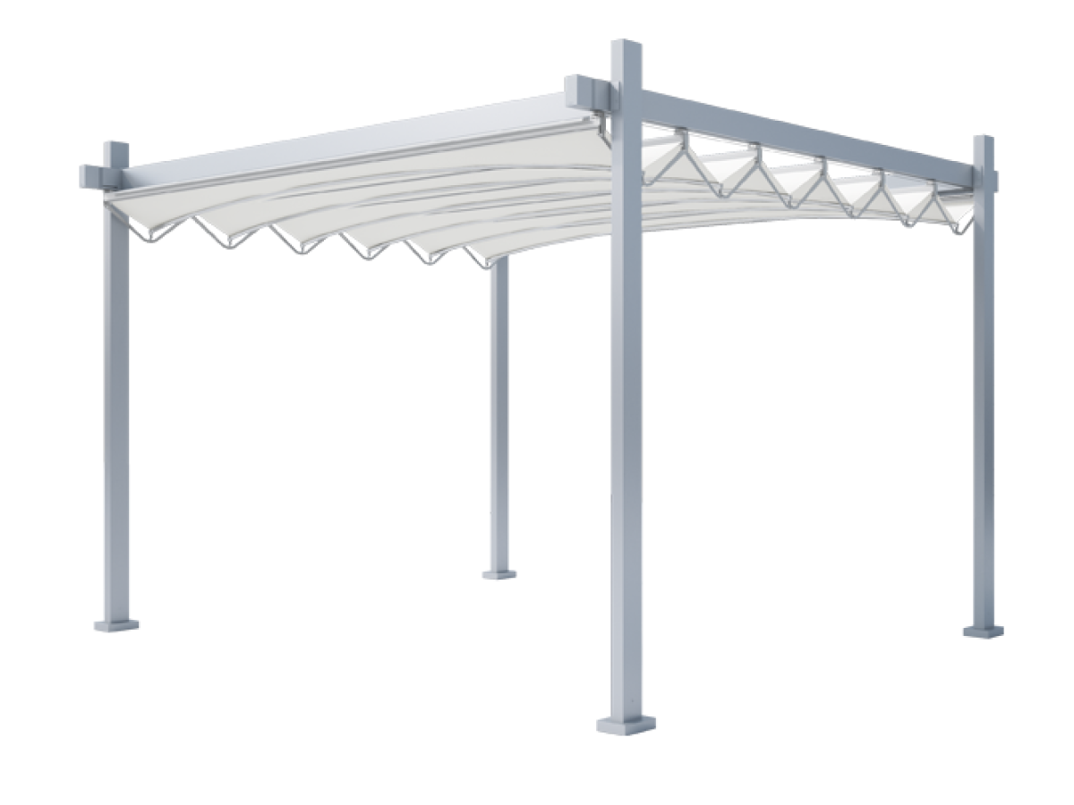 Technology: The fabric runs through an innovative tensioning and holding system which is moved by a first-class radio motor with a radio hand-held transmitter or with a manual crank. Optionally, the pergola roof can also be controlled via a smartphone app.